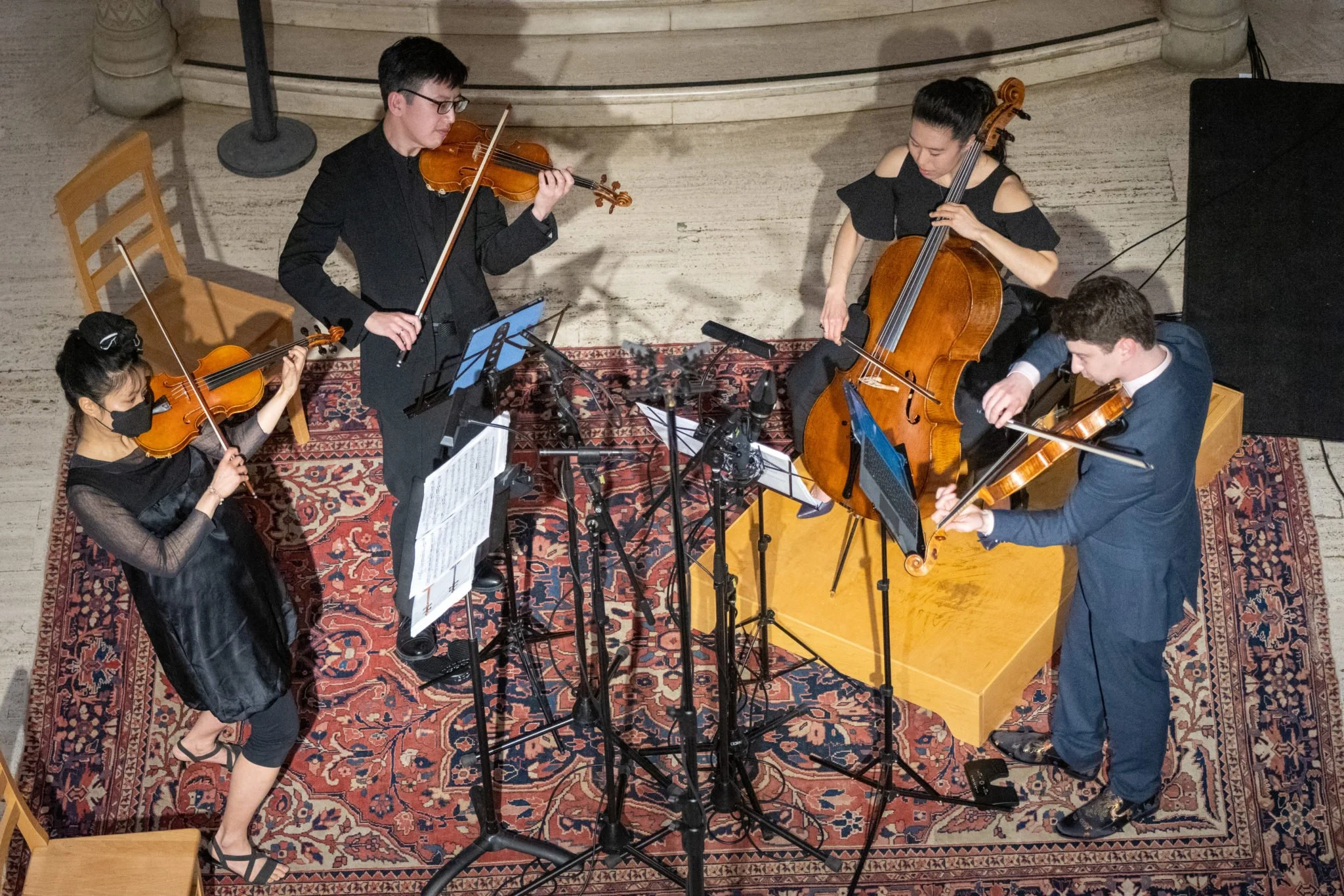 From left to right: Matthew Cohen (viola), Deborah Pae (cello), Wayne Lee (violin), and Jasmine Lin (violin)